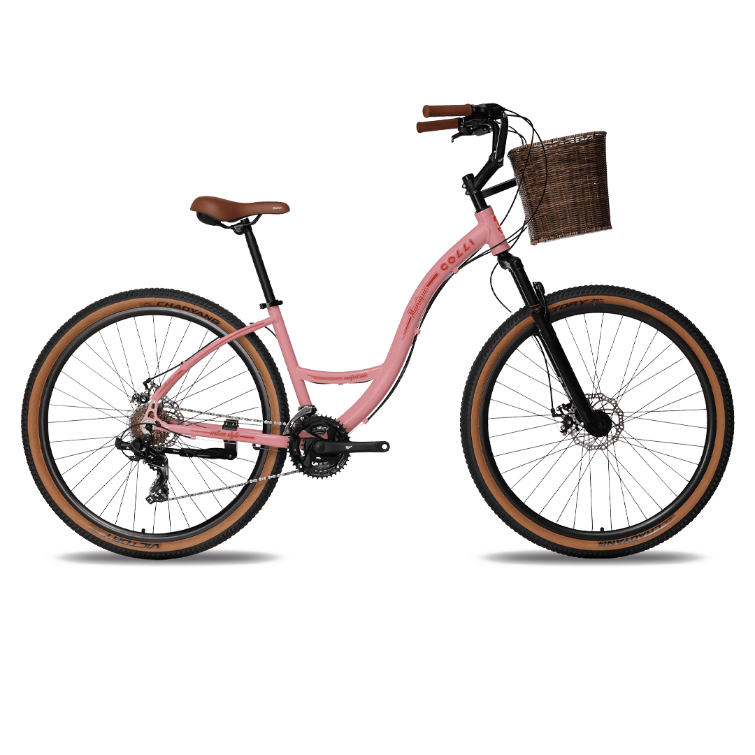 A MUNIQUE é o modelo da COLLI com quadro fabricado em alumínio com garantia vitalícia, rebaixado para facilitar a entrada e saída do ciclista, guidom beach confort para melhorar ainda mais a experiencia ao pedalar. O sistema de transmissão de 21 marchas com câmbio traseiro Shimano ajuda nos percursos ondulados e a suspensão de 100mm de curso alivia as nuances do terreno. Tudo isso para aproveitar do máximo o passeio e contemplar tudo a sua volta. O design e as 3 lindas cores dão estilo diferenciado nessa bicicleta que combina perfeitamente com a natureza e os caminhos que ela te leva. Pensou bicicleta, VAI DE COLLI!