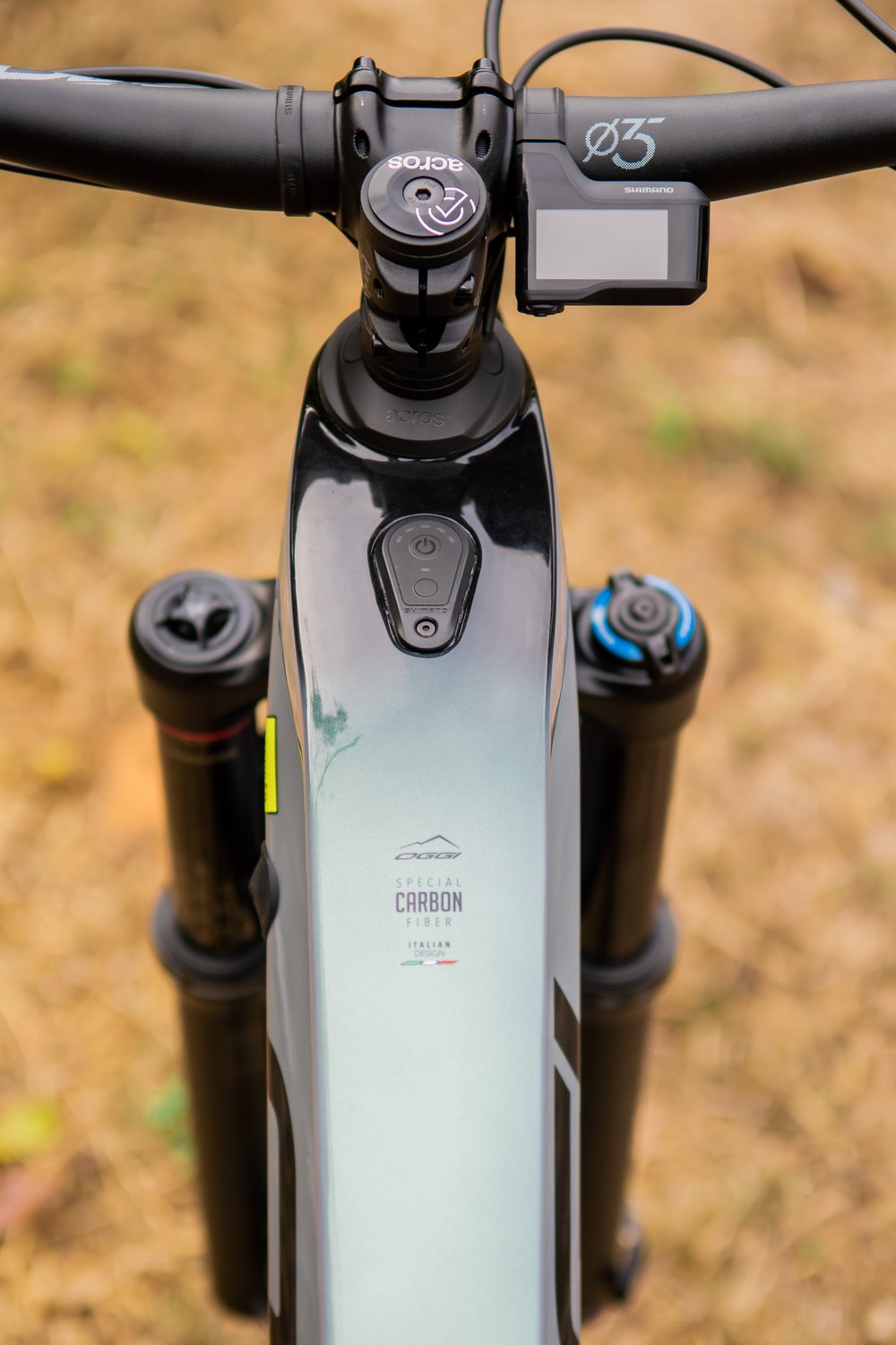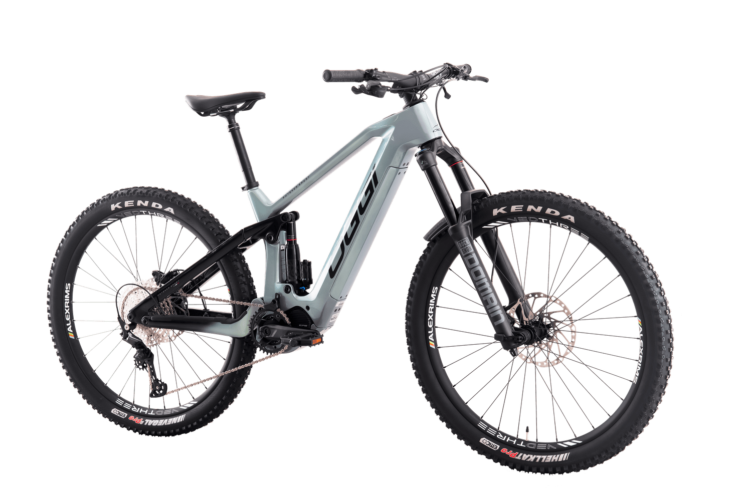 QUADRO - Quadro em fibra de carbono full suspension com 160mm de curso com bateria integrada e removível ao tubo inferior com rota interna dos cabos e gancheira UDH*